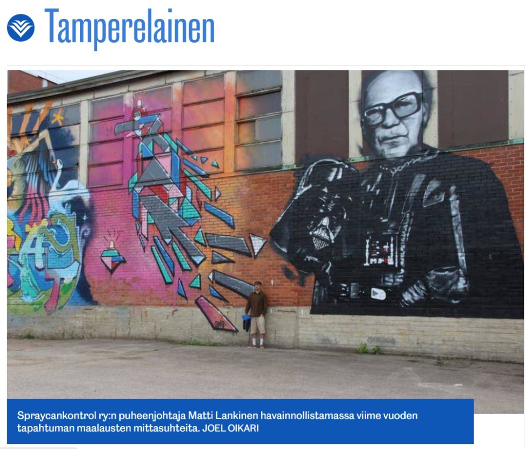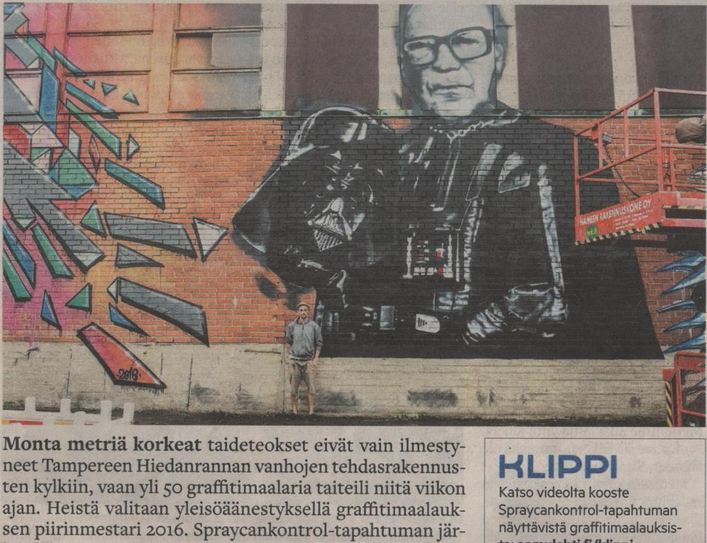 Darthkekkonen, Muraali Aamulehti 22.8.2016 Tamperelainen 23.7.2017 Yle Tampere 19.8.2016 Related Tagged 2016, finland, hiedanranta, iso seinämaalaus, kekkonen, lielahti, muraali, muraali maalaus, mural, seinämaalauksia, seinämaalaus, seinämaalaus muraali, spraycankontrol, streetart, tampere, ukk, yritysilme
